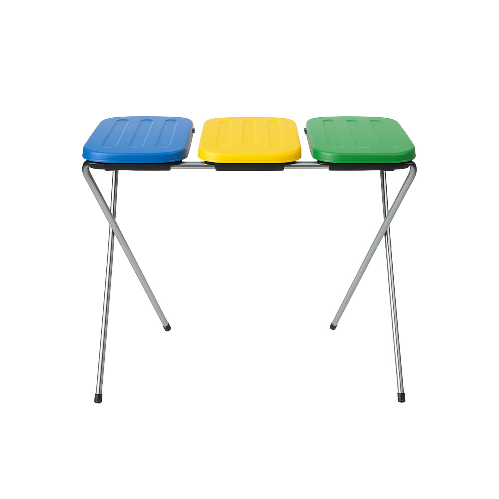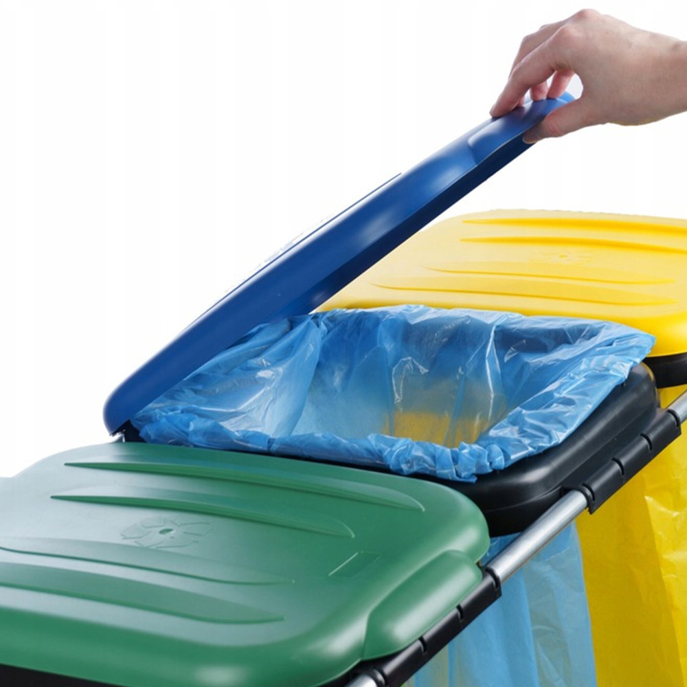 Az összecsukható szemeteszsák-tartó állvány praktikus megoldás mindazok számára, akik átláthatóan és hatékonyan szeretnék szelektálni a hulladékot. A sárga, zöld és kék színű fedelek megfelelnek a hulladékválogatásra vonatkozó európai szabványoknak, és lehetővé teszik a megfelelő kuka gyors felismerését.