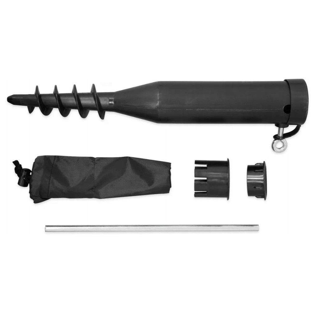 - Komplett készlet: A csomag tartalmazza a stabil rögzítéshez szükséges földhorgonyt (kotva) és egy védőhuzatot is, amely megóvja a köteleket a piszoktól, amikor nincs használatban.